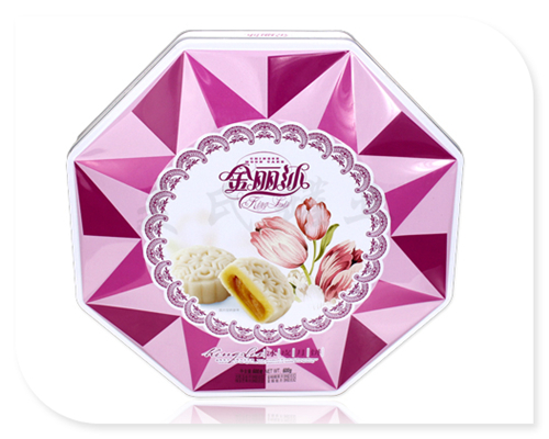 這款大酒樓月餅包裝鐵盒,版面設計為厚重得體的設計風格,銷售對象多數是禮品 。而這款月餅鐵盒的印刷工藝多樣化,在0.23mm的馬口鐵上過白油(可過白瓷),再根據您的印刷設計要求印刷各種精美圖案,印刷后的鐵料正反兩面再次過上一層光油。蓋子中間有圓形開窗設計,完全符合鐵盒的使用理念,盒蓋為外卷線天地蓋。鐵盒可包裝大約八只月餅產品。