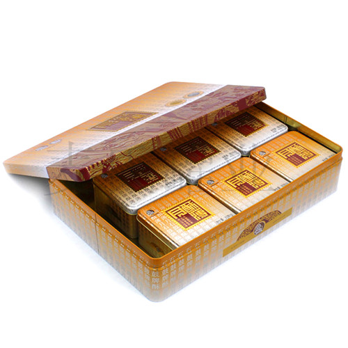 十二個裝月餅豪華鐵罐表面處理為單面四色+專色,富士印鐵設備輥筒膠印;內外過光油,而外觀效果選擇眾多,可過啞光油、珍珠油、爆炸油、皺紋油、橡皮油等方式。在打樣過程,可選擇多種外觀效果進行制作比較。