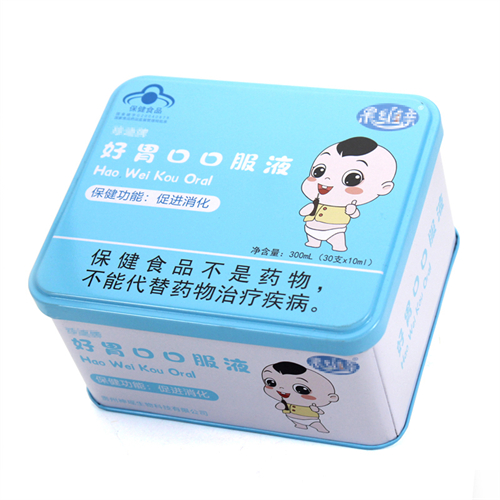 此款長方形口服液通用藥品鐵盒的尺寸為130*112*75mm,為了順應多樣化的市場包裝需求,這款茶葉馬口鐵盒可做成心形、正方形、橢圓形、車形、書本形等異形造型。