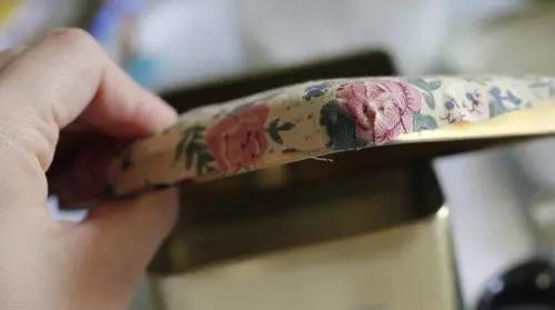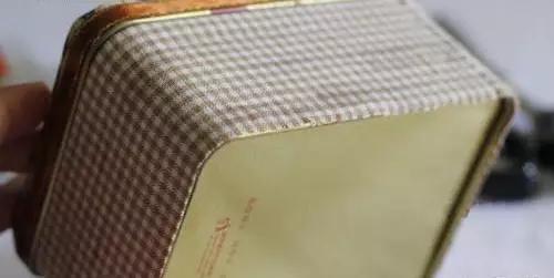 4、表布拐角處剪牙口,鐵盒邊緣涂上白膠,仔細按壓。