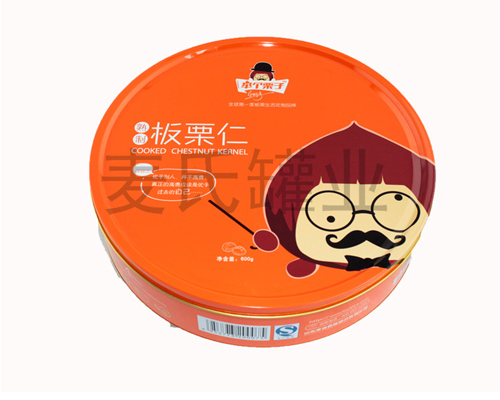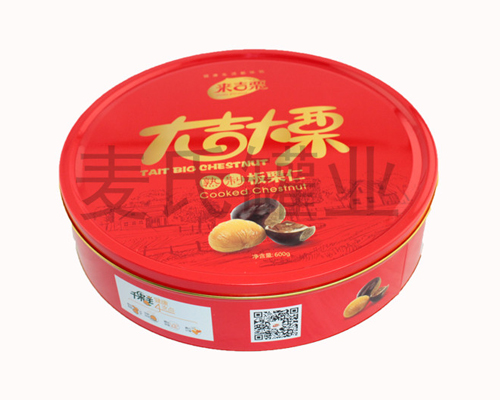 圓形板栗鐵盒子印刷說明:鐵罐的表面印刷為單面印刷,為CMYK四色,而版面設計稿可由客戶自行設計或我司設計。印刷選擇方面,可選擇單/雙面,四色、專色或四色+專色印刷,常規條件下為一專色+四色印刷。在印刷表面還罩上一層亮光油,內壁上一層食品級別金油。而外層果油可選擇不同效果的油料印刷,例如啞油、真珠油、爆炸油等。