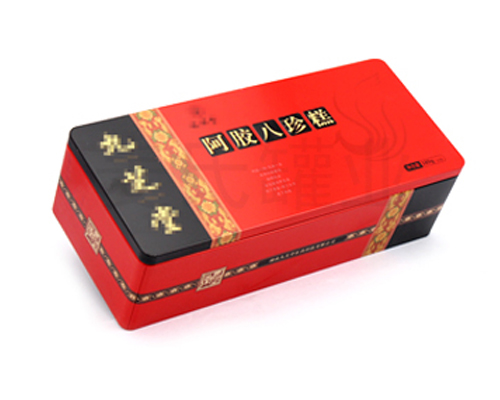 好的產品再配上好的包裝,能夠讓消費者產生沖動的購買欲望,此款180g裝阿膠八珍糕禮盒鐵罐子,長方形造型,由蓋、內蓋、身、底四個部分組成,內過光油,外過啞油、顏色鮮艷明亮,無色差,客戶還可根據您的產品需求選擇過透明油、爆炸油、皺紋油等其他油墨,多方面滿足您的包裝需求。